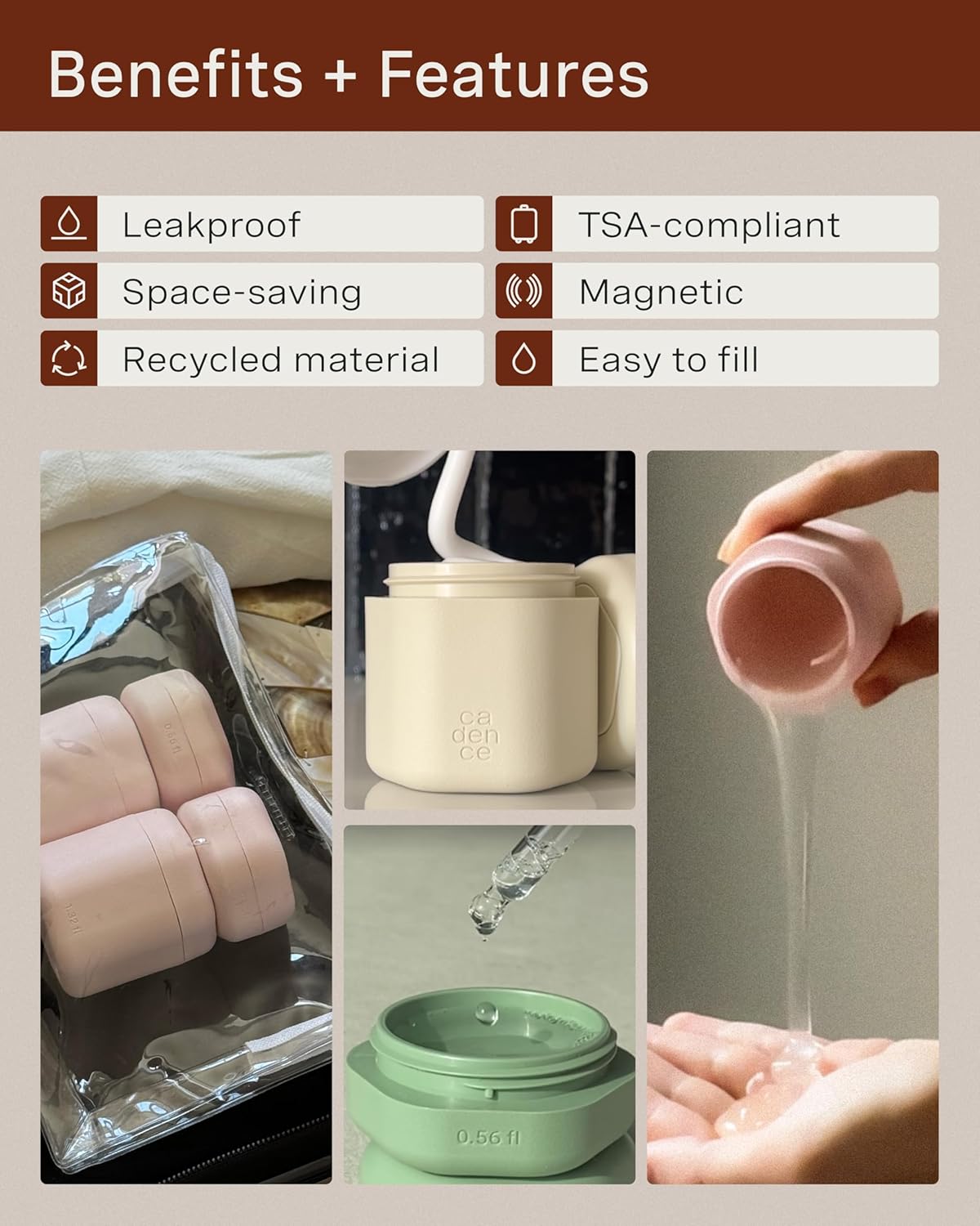 - OFFICIAL CADENCE DESIGN - Meet the Cadence Basic Skincare Capsule Set, the ultimate travel essentials for women and men who want to keep skincare products neatly stored. These reusable capsules for travel toiletries comes with a labeled tile: cleanser, moisturizer, and a sun icon.