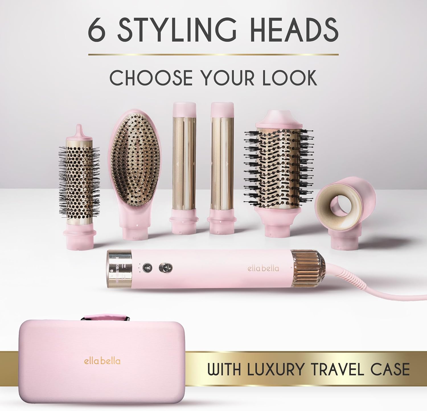 ELLA BELLA® 6 in 1 Professional Hot Air Styler • Powerful Hair Dryer & Straightener Set • Styling Without Heat Damage • Fast Drying Curling Volumizing Straightening • Protective Travel Case (Pink)