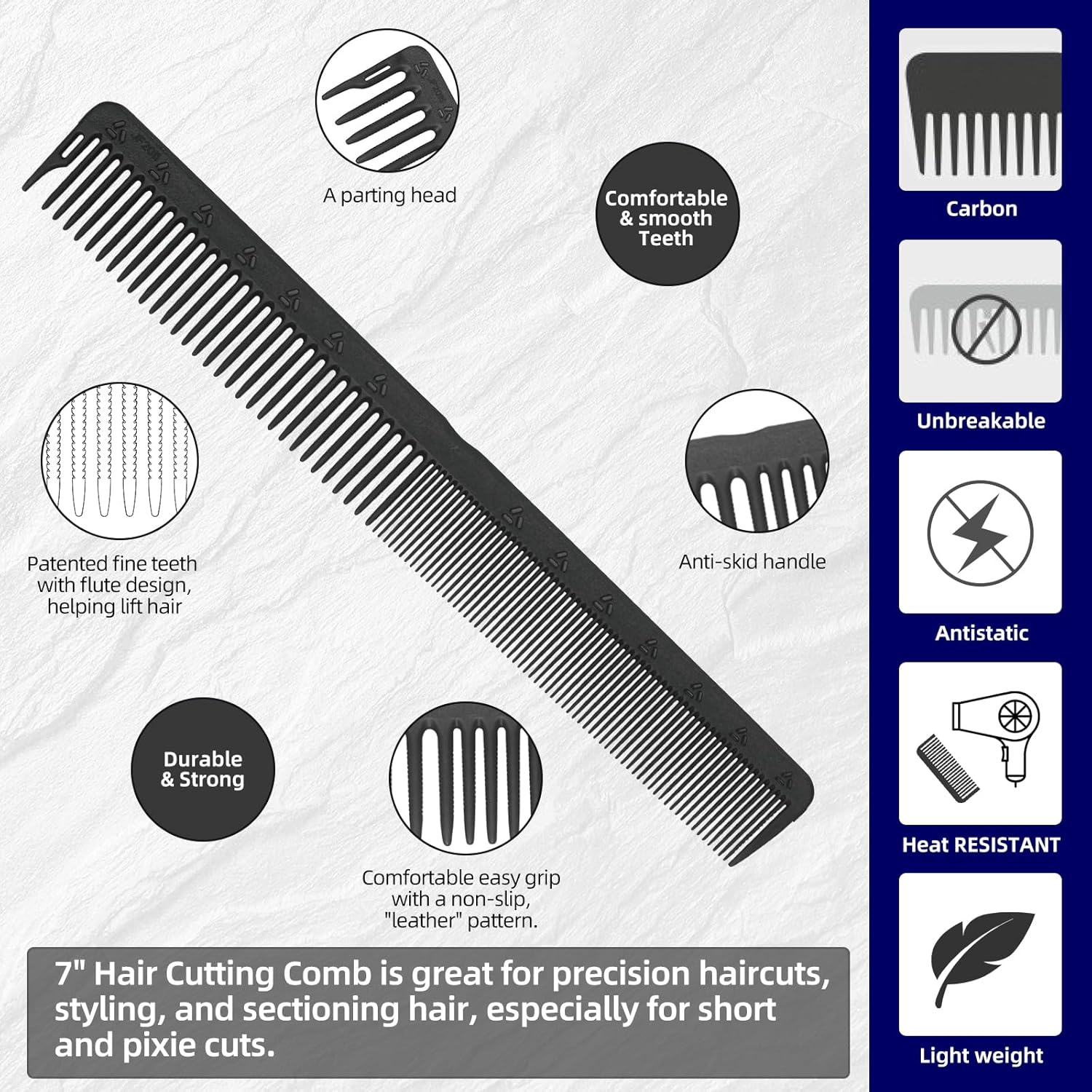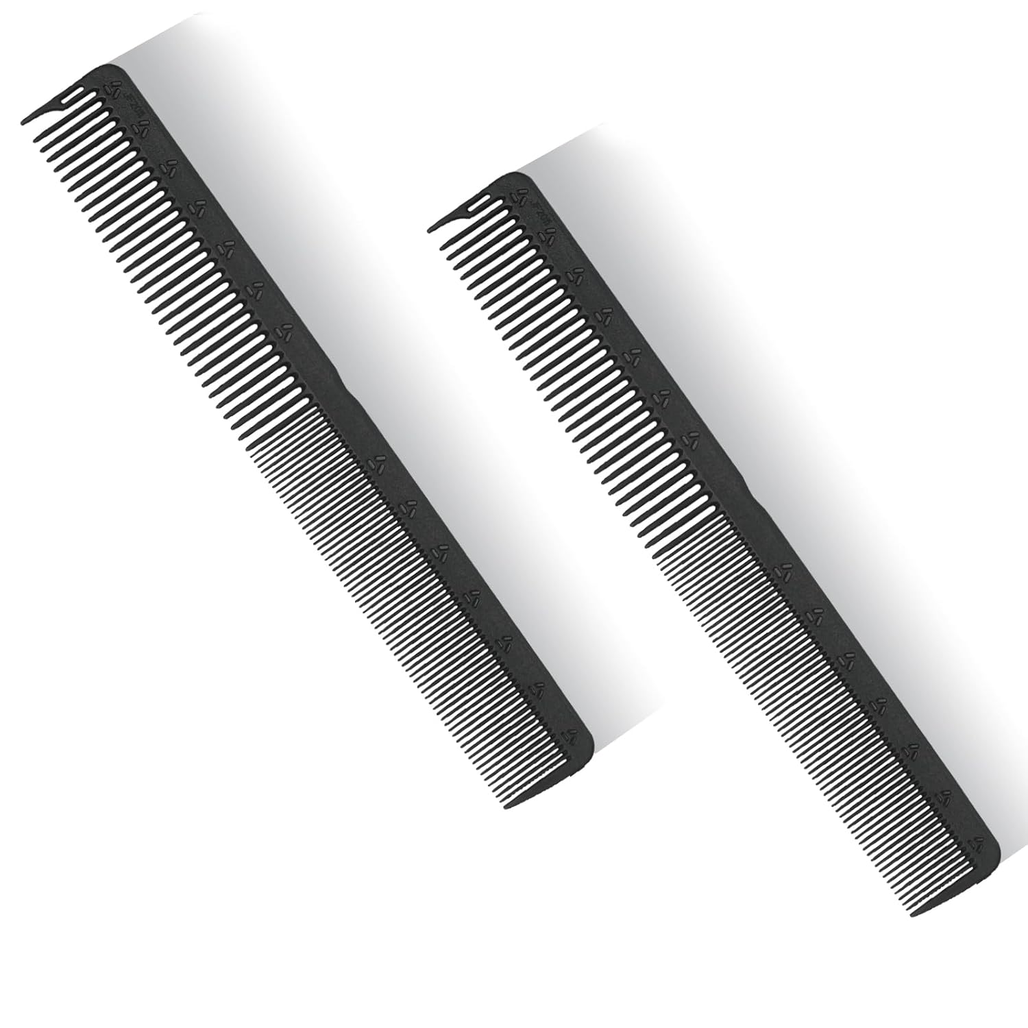 • Durable and Heat Resistant: This 2-pack carbon combs are designed to withstand heat up to 350 F, making them perfect for use with heated styling tools. Additionally, their durability is enhanced by their virtually unbreakable nature and lightweight design. These features make them an ideal choice as hair cutting combs.