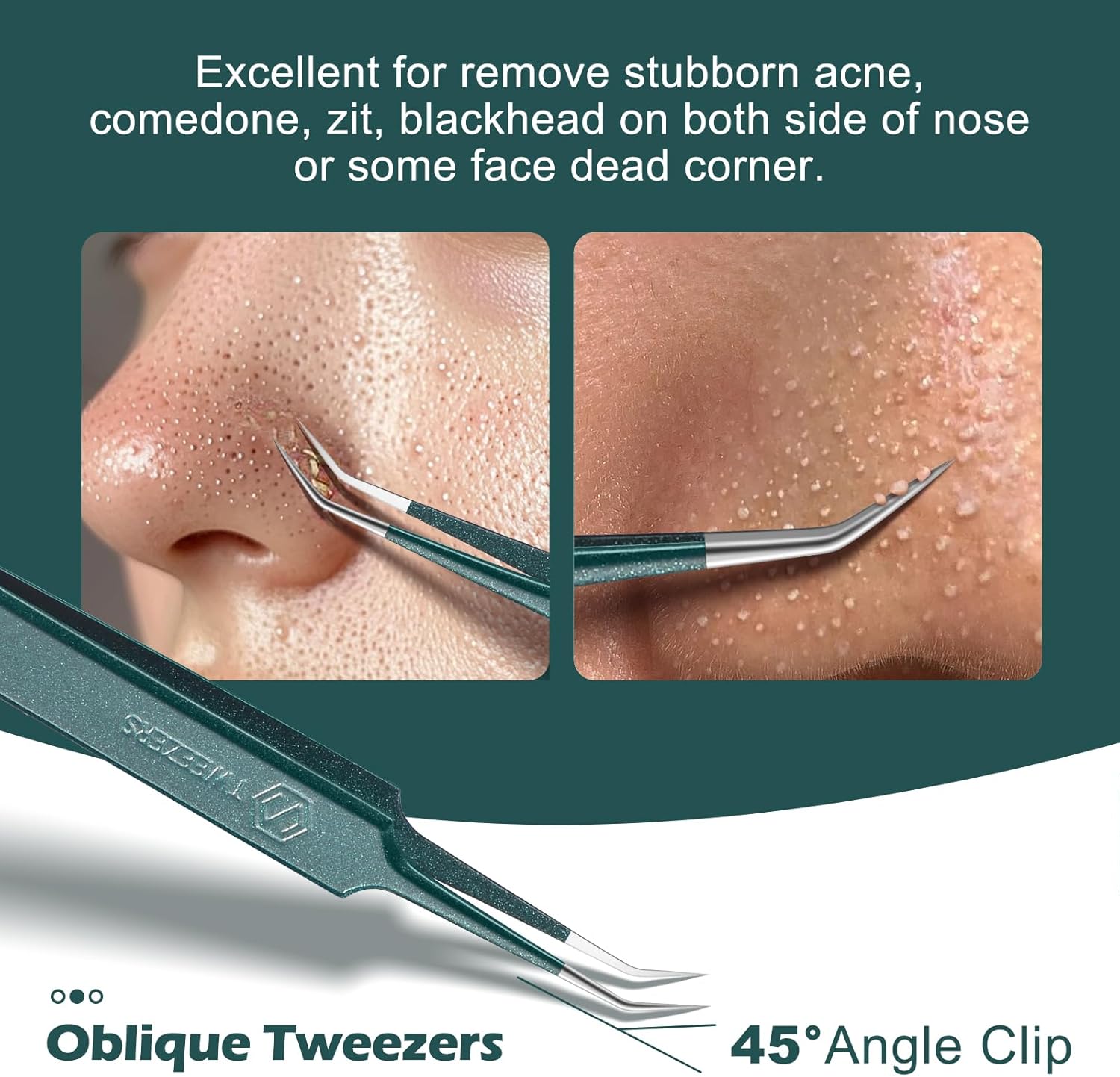 - Blackhead Tweezers with Oblique Tweezers: effectively removing blackheads, pimples, and other blemishes on chin, forehead flat area.