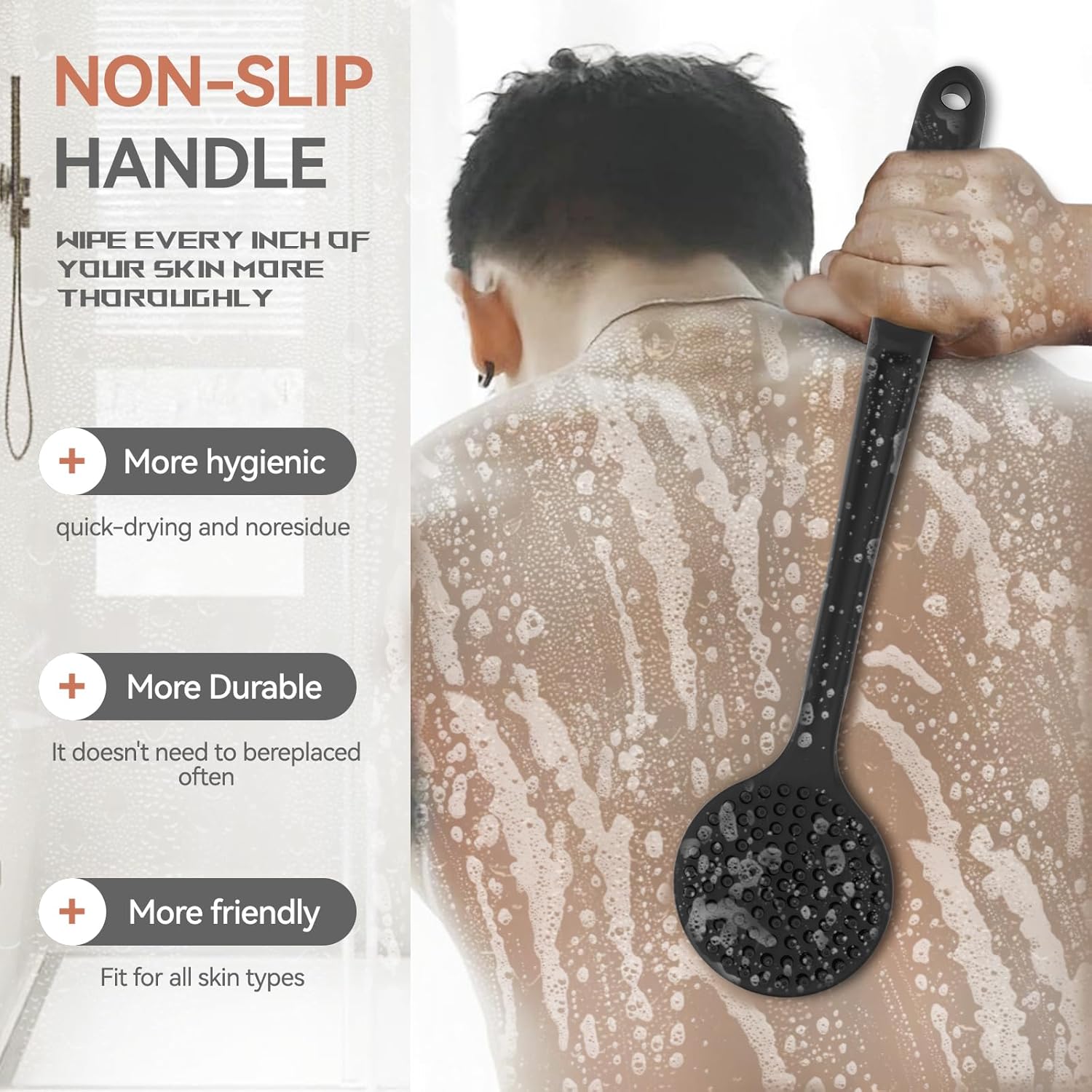 • ECO-FRIENDLY SILICONE: Crafted from safe and durable food-grade silicone, our body bath scrubber is gentle on your skin while still offering effective exfoliation and cleansing.