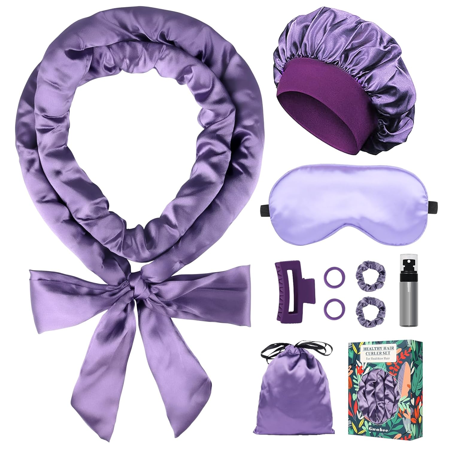 - Thoughtful Set for Women: Our heatless curling set includes 10 items: 1 x 70-inch long satin curling rod headband, 1 x satin hair bonnet for sleep, 1 x silk satin sleep eye mask, 1 x hair clip, 2 x satin hair ties, 2 x elastic hair ties, 1 x satin storage bag, and 1 x spray bottle. This all-in-one curling rods set is packaged in an exquisite box, making it the perfect present for your wife, mother, daughter, friends, or colleagues