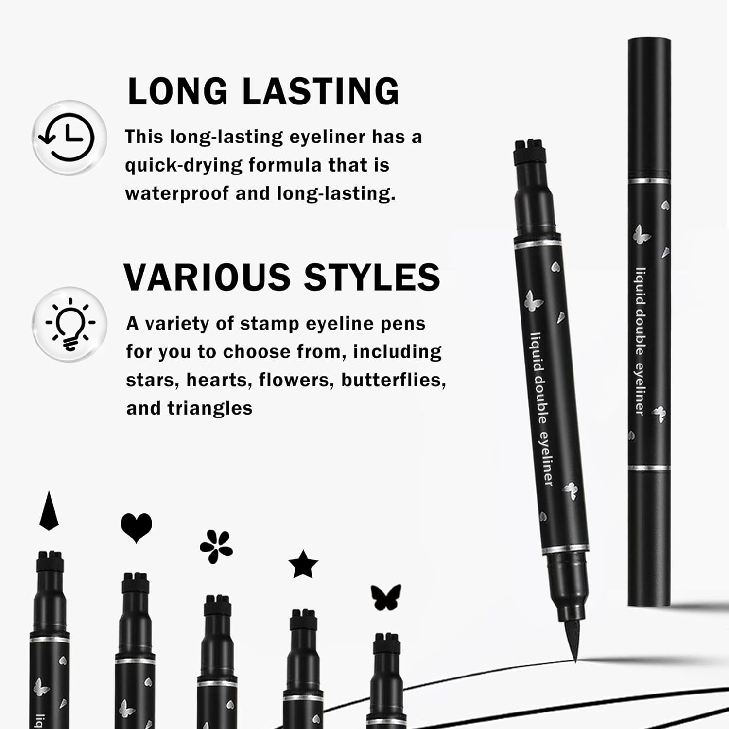 - STAMP EYELINER PEN: A variety of stamp eyeline pens are available for you to choose, including star, heart, flower, butterfly, triangle shape, soft nibs, smooth eyeliner, and the best choice for creating perfect cat wing eye makeup