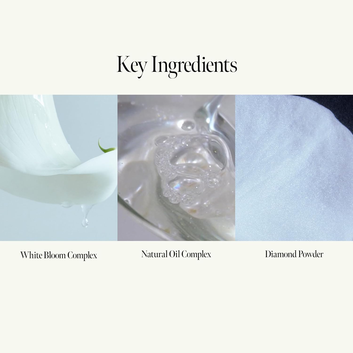 - Creates a Pearl-Like Gloss Layer - Infused with White Bloom Complex and Diamond Powder to form a reflective gloss film that enhances shine, smoothness, and light-catching radiance.