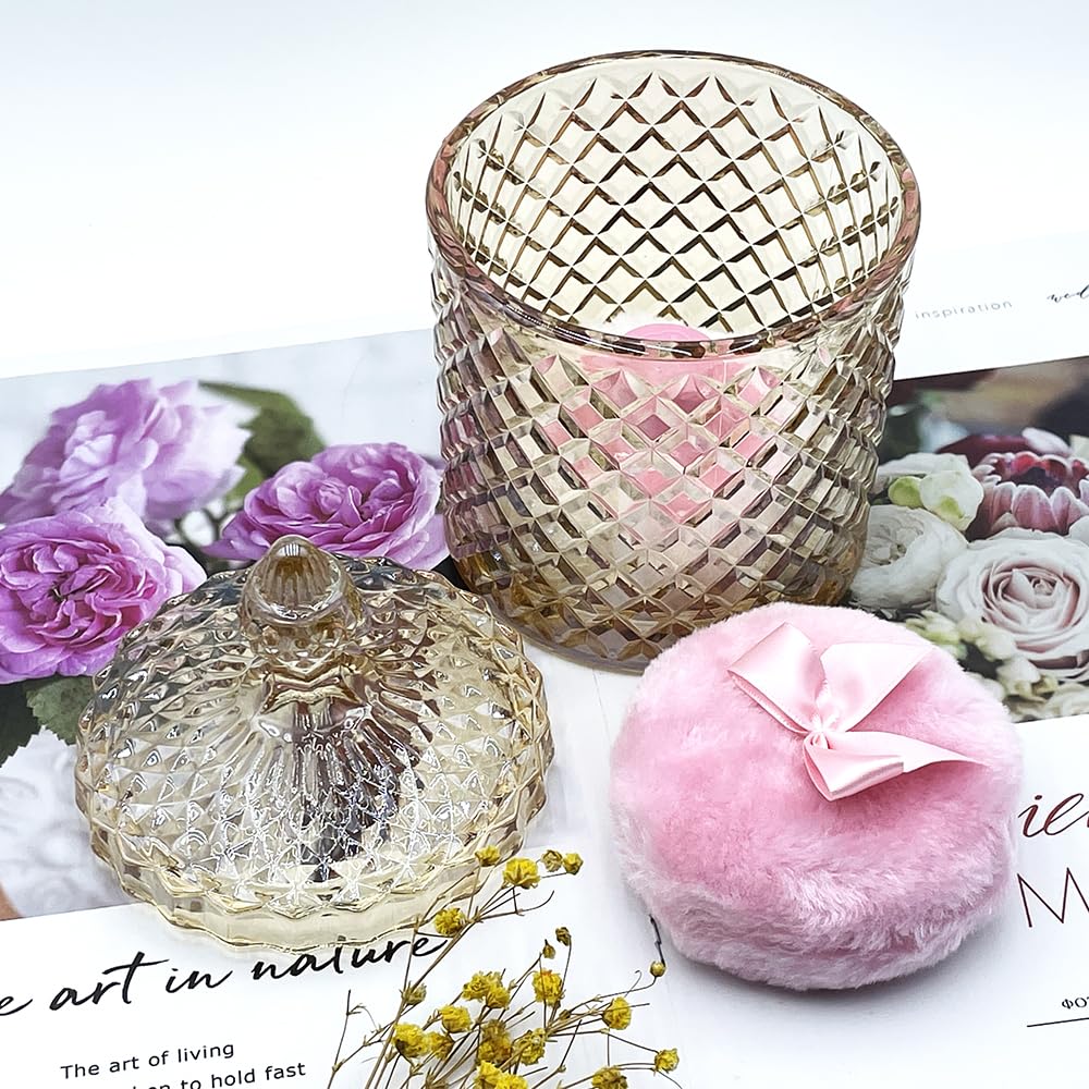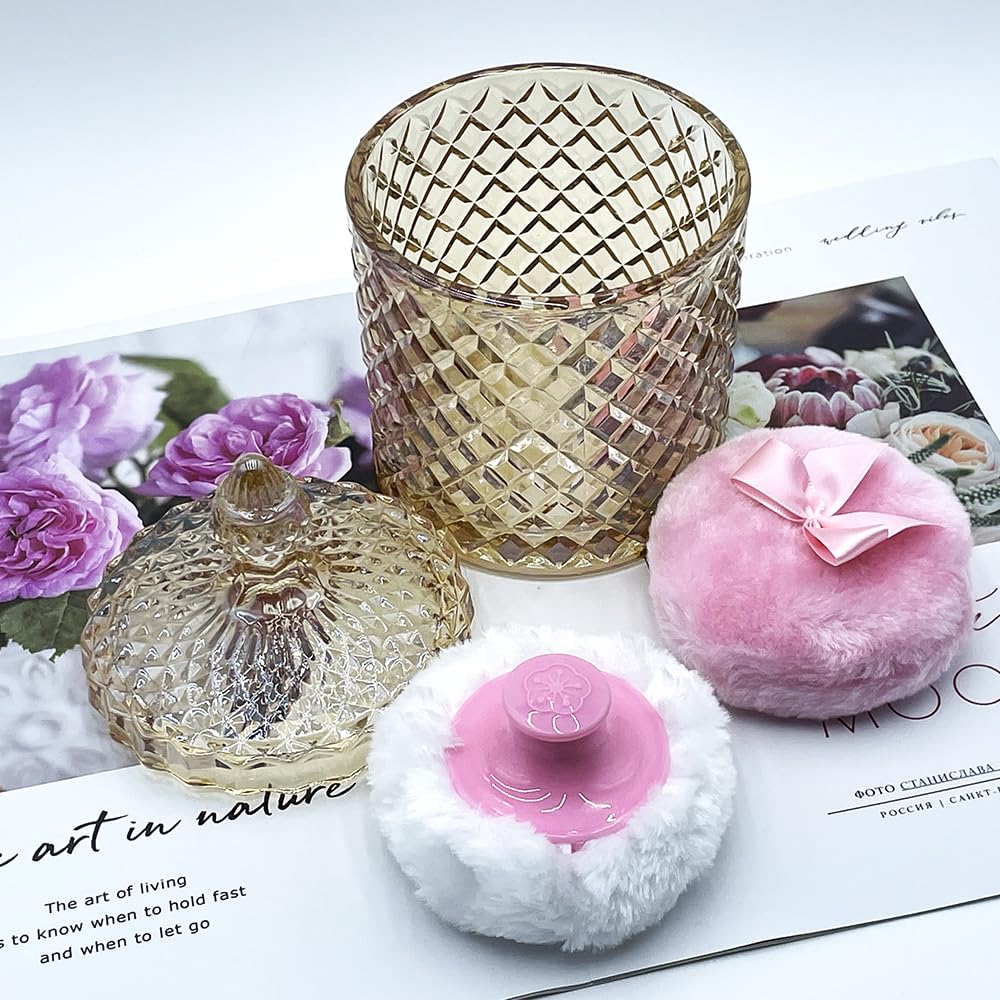 - Premium 2 Powder Puffs & 1 Stylish Jar Combo: Includes 1 × Body&Setting Powder Puff (3.5"/9 cm) ,1 × Body Powder Puff with Handle(3.15"/8cm) and 1 × Premium Large Glass Jar(4.2"L x 4.2"W x 7"H,including lid,Capacity: 20oz) with vavious color options.