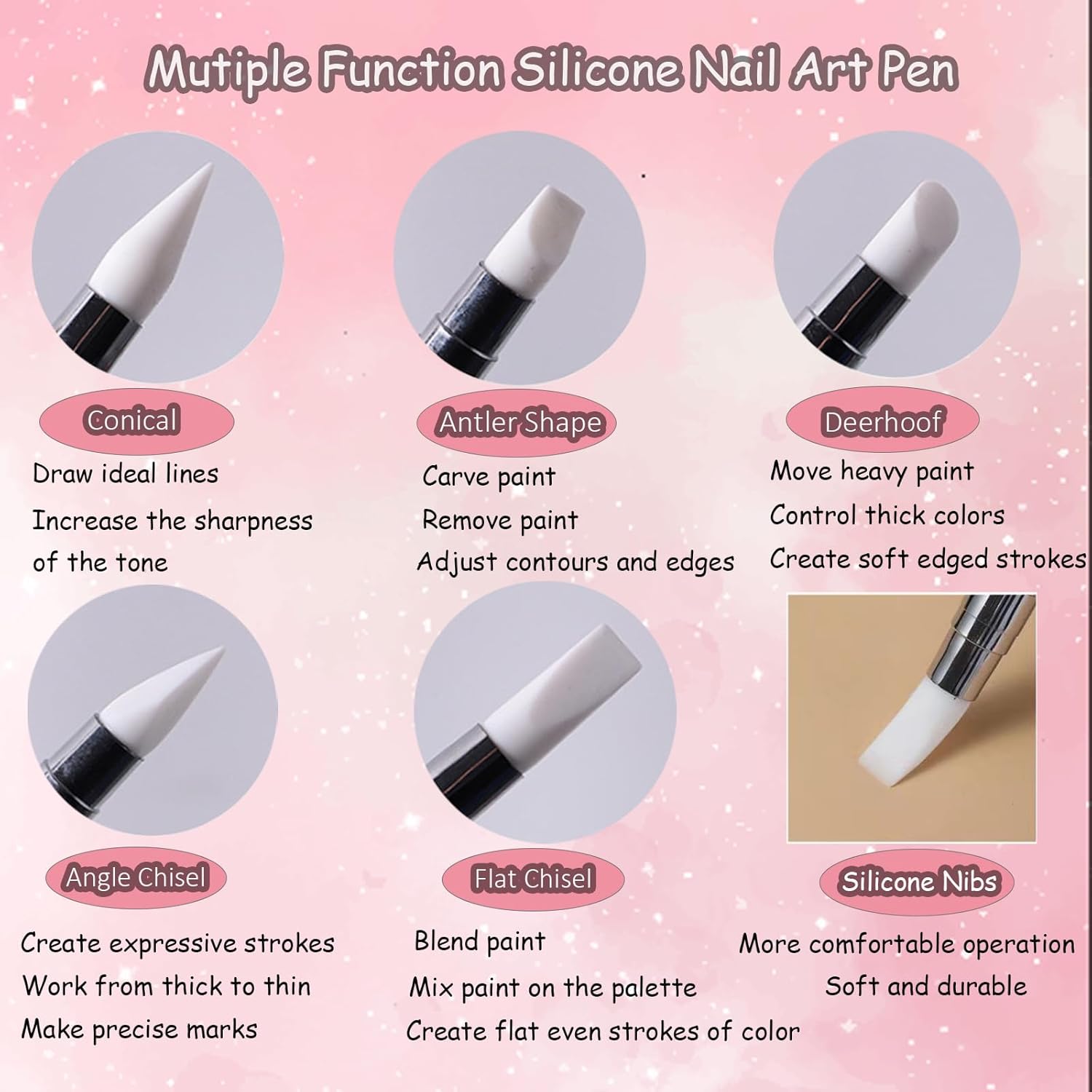 - 【Dual-Ended Design Kit】Whmeolyo nail brush tools with Dual-Ended design, including 5 different colors of hollow carving embossing pens and 6 dot-drilling line drawing pens. Each silicone pen has two different shaped pen heads. Dot-drilling line drawing pens one side is nail art liner brushes; the other side is dotting tools, convenient for you to do different crafts, you can use the brush to create your own favorite DIY nail style as you like.