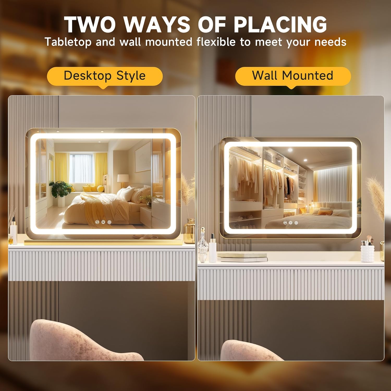 - đăSmart Touch Control & Memory FunctionăThis makeup mirror with lights has 3 smart touch buttons, turn on/off the light by touching the sensor switch, Press left button to change the color modes, long press right button to adjust the led brightness. This lighted makeup mirror is specially designed memory functionfunction keep your lights setting like your last use.
