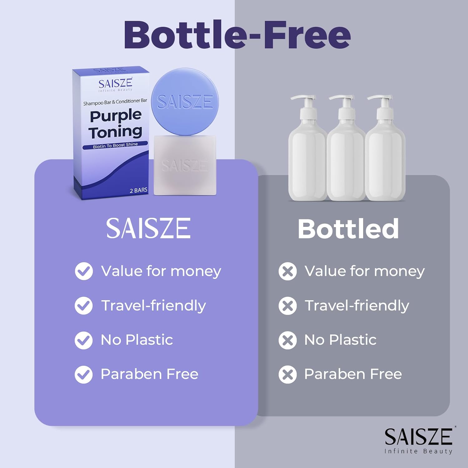 • Purple Toning: Specially formulated shampoo and conditioner bar designed to neutralize brassy and yellow tones in blonde, silver and gray hair