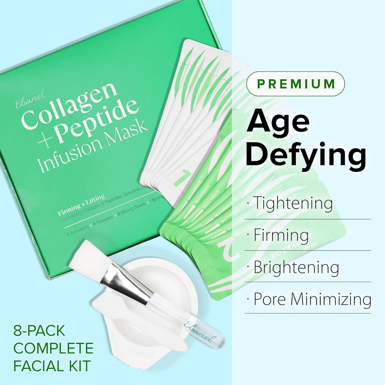 Ebanel Collagen Peptides Wash-Off Face Mask Set, 8 Pack Instant Skin Tightening and Lifting Masks, Brightening Face Mask with Niacinamide, Glutathione, Hyaluronic Acid, Vitamin C, Cica, B5, Albumen