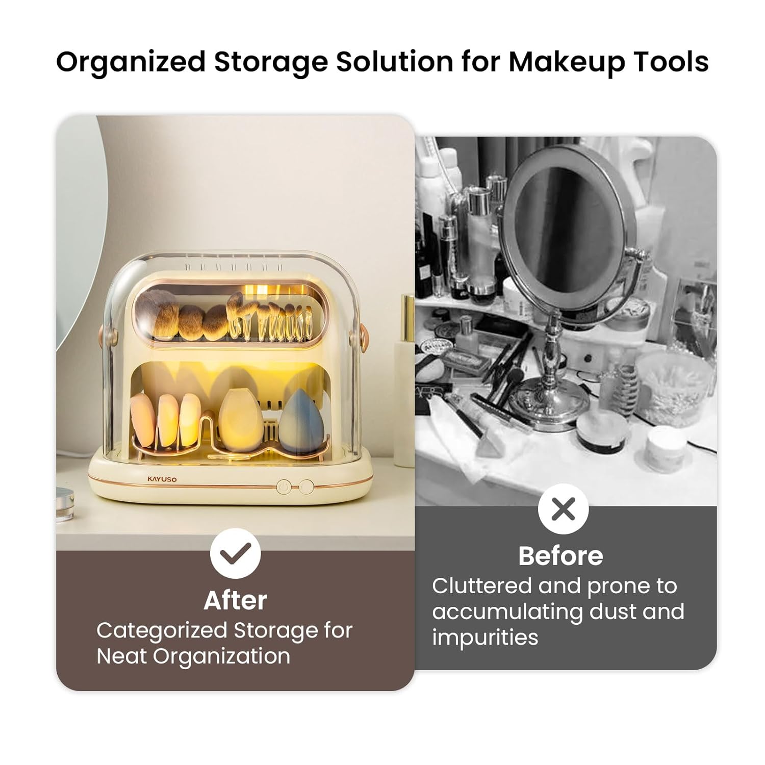 - Smart Zoning Design: With a spacious, structured interior, it holds multiple makeup tools—brushes, powder compacts, beauty blenders, and more—all at once. Whether placed on your bedroom vanity, bathroom counter, or living room shelf, it adds a sleek, organized touch to any space, elevating your home’s aesthetic while keeping essentials perfectly accessible