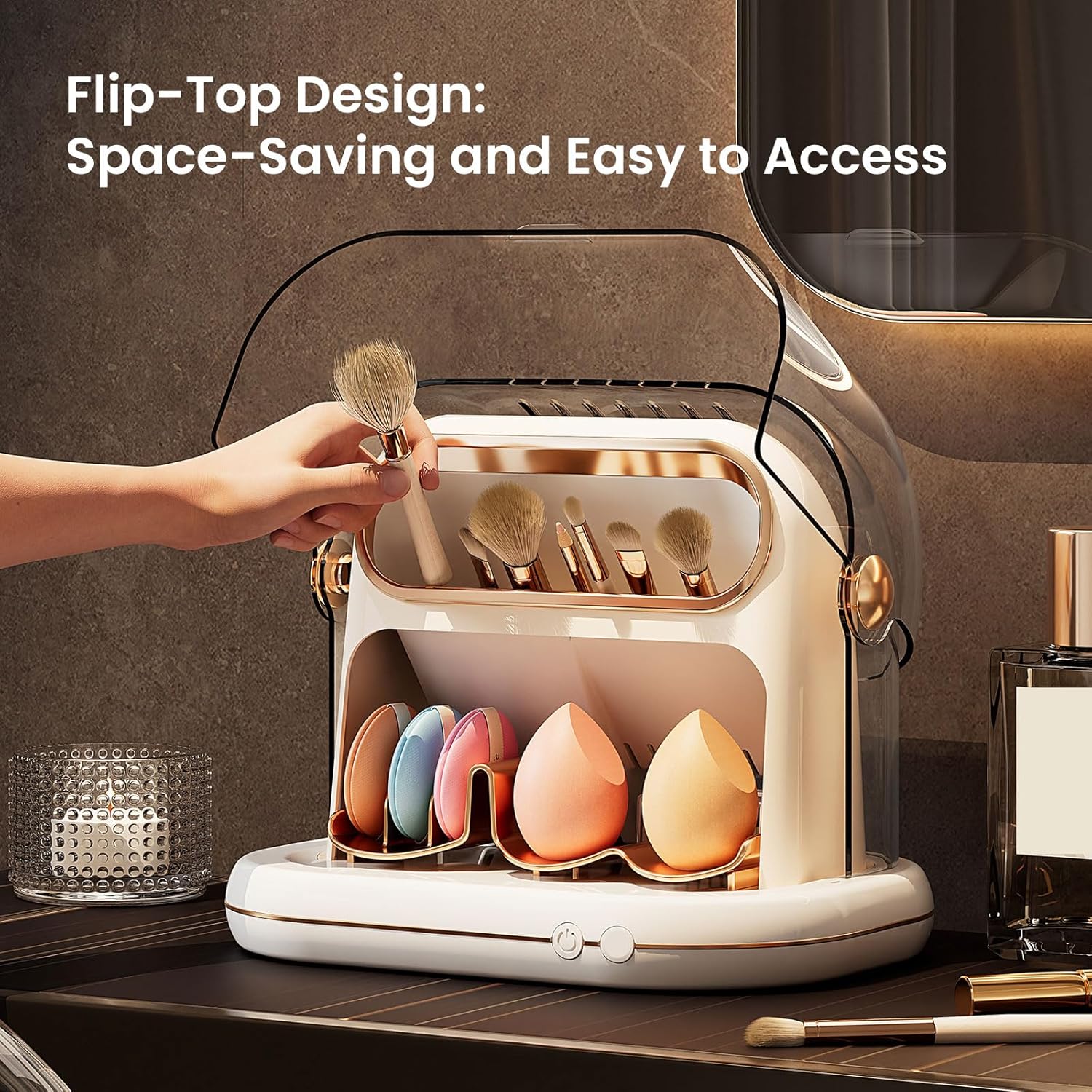 - The 360° Circulating Dry system: The makeup brush dryer features smart zoning for optimal care. The upper low-temp zone preserves brush shape while keeping bristles fluffy and soft, preventing bristle damage for long-lasting premium quality, while the lower medium-temp zone uses direct airflow for efficient drying that maintains elasticity and shape in beauty blenders and sponges—no deformation, just lasting bounce