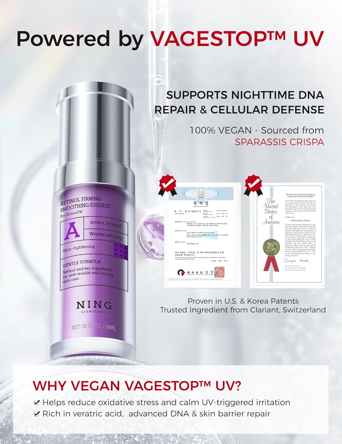- 【Dual-Patented Defense for Night Repair】Infused with VAGESTOP UV , our formula helps repair daily DNA damage caused by UV exposure while you sleep. This korean retinol innovation offers antioxidant support, boosts collagen, and strengthens the barrier with ingredients backed by patents from the US, Korea—perfect for firming and nightly skin renewal.