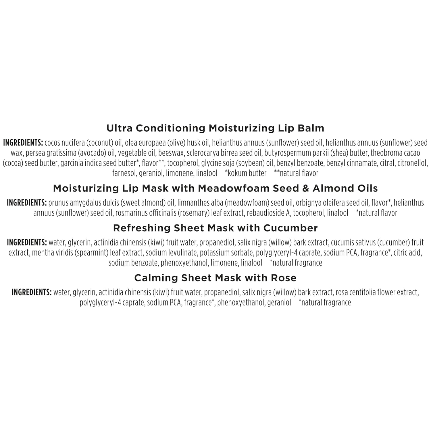 - FACIAL SHEET MASKS: Refreshing Sheet Mask with Cucumber moisturizes, refreshes and awakens skin, while Calming Sheet Mask with Rose helps balance pH for soft, hydrated skin