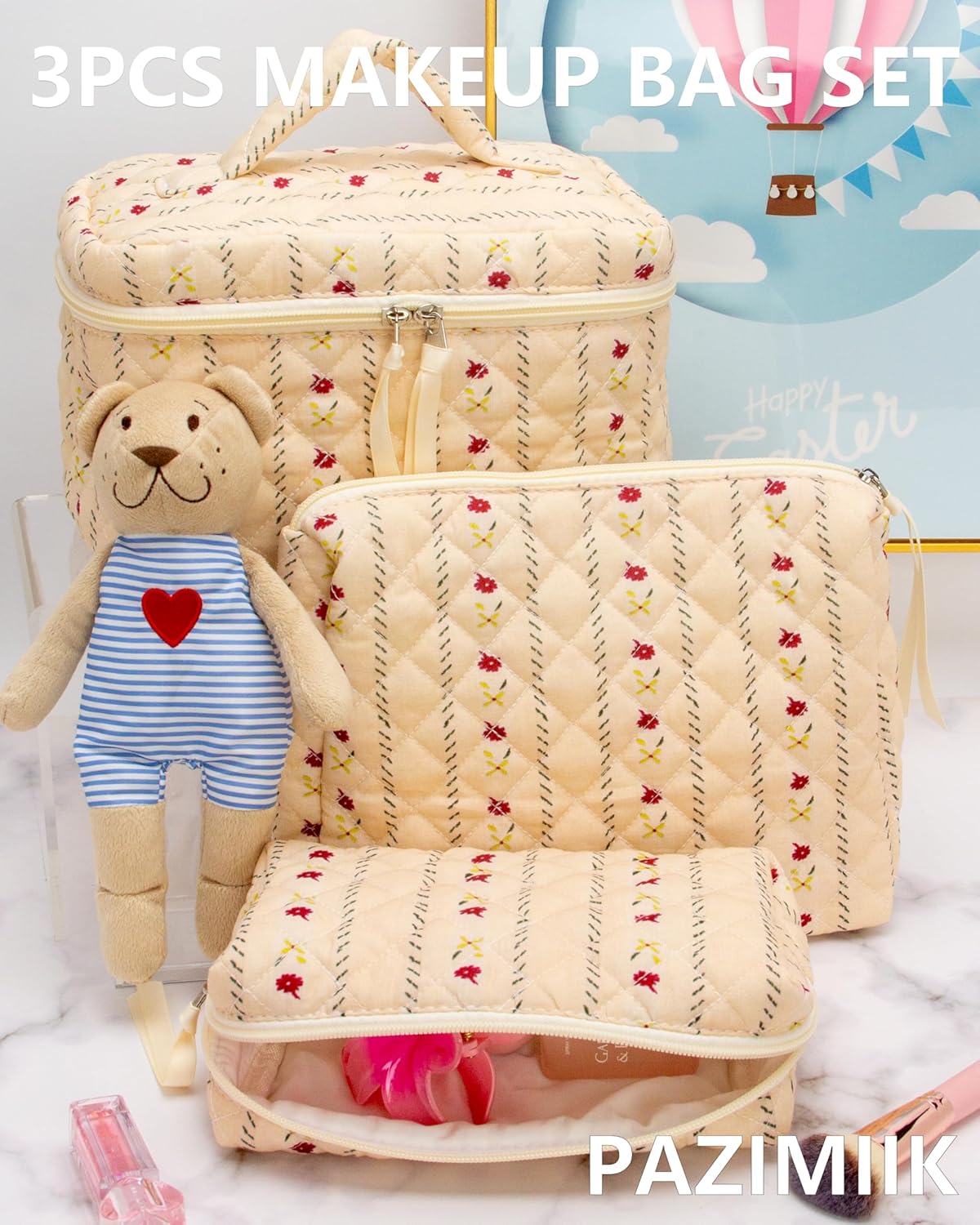 PAZIMIIK 3PCS Makeup Bag SET Large Travel Quilted Zipper Soft Cosmetic Case Pouch for Women Girls Make Up,Little Flower Beige