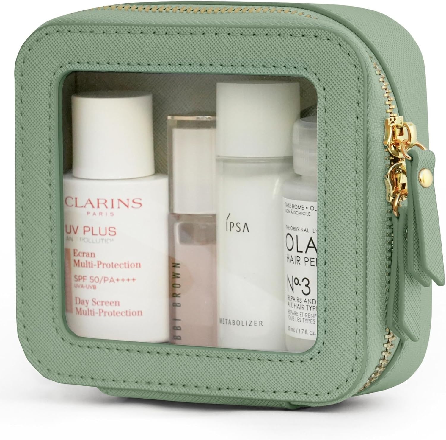 - [Premium Material and Durability] – The clear small cosmetic case, both the exterior and interior, is crafted from high-grade saffiano faux leather, which is highly scratch resistant, durable and exceptionally easy to keep clean. It features a smooth zipper for secure closure, and elegant light gold metal hardware accents, adding a luxurious and sophisticated touch to the bag's overall design.