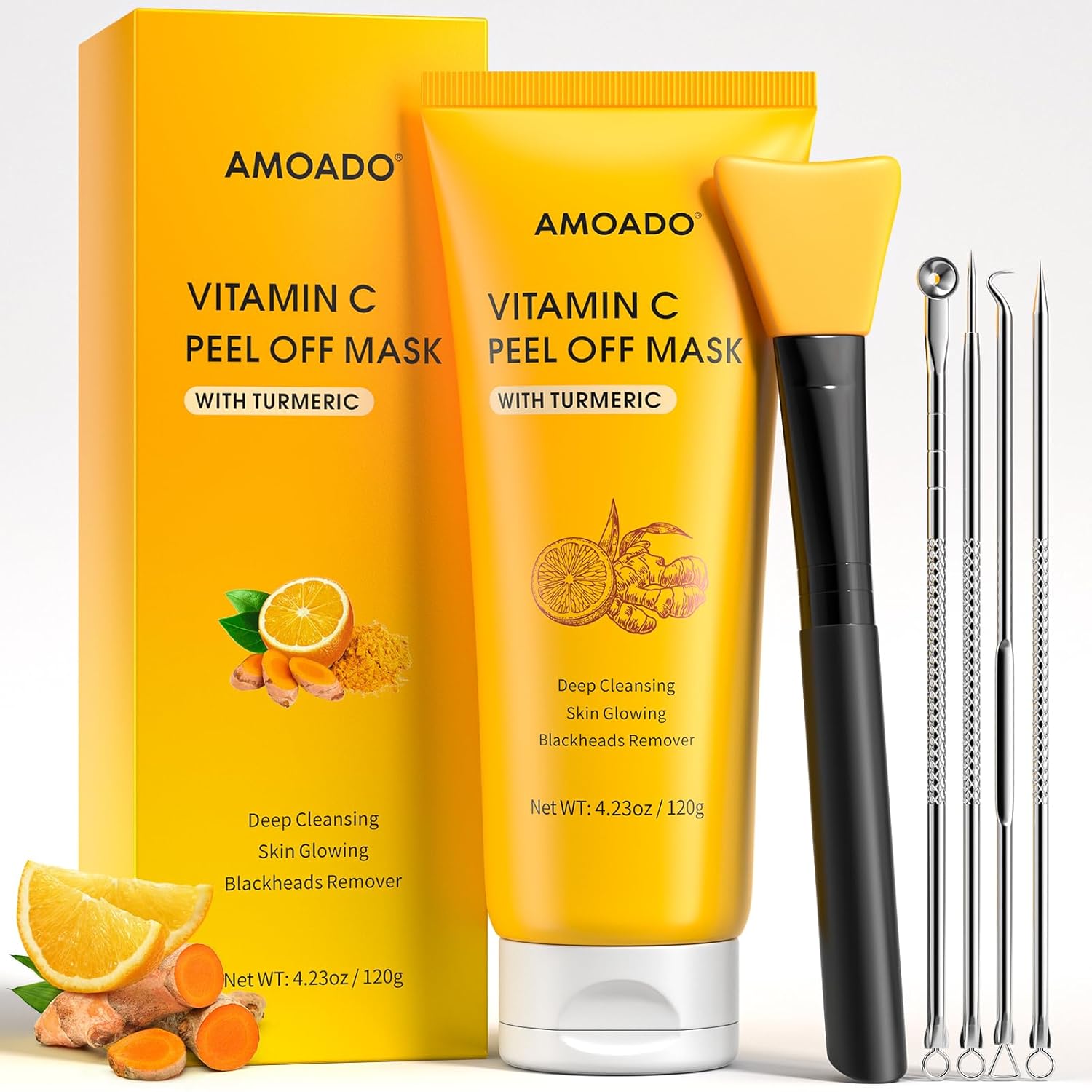 Blackhead Remover Mask, Peel Off Face Mask with Vitamin C & Turmeric for Men and Women–Deep Cleansing Nose Facial Mask for Blackheads, Pores & Oil Control with Pimple Extractor and Brush