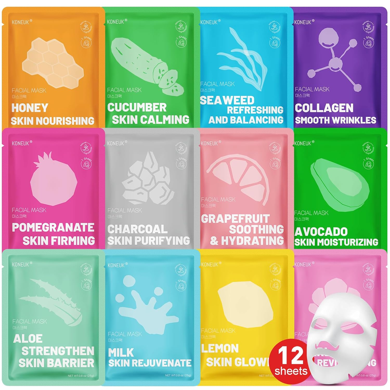 12 Pack Collagen Hydrating Face Masks Skincare, Sheet Face Mask for All Skin Types, Facial Masks Set for Women Skin Care, Face Mask Bulk Spa Gifts for Women