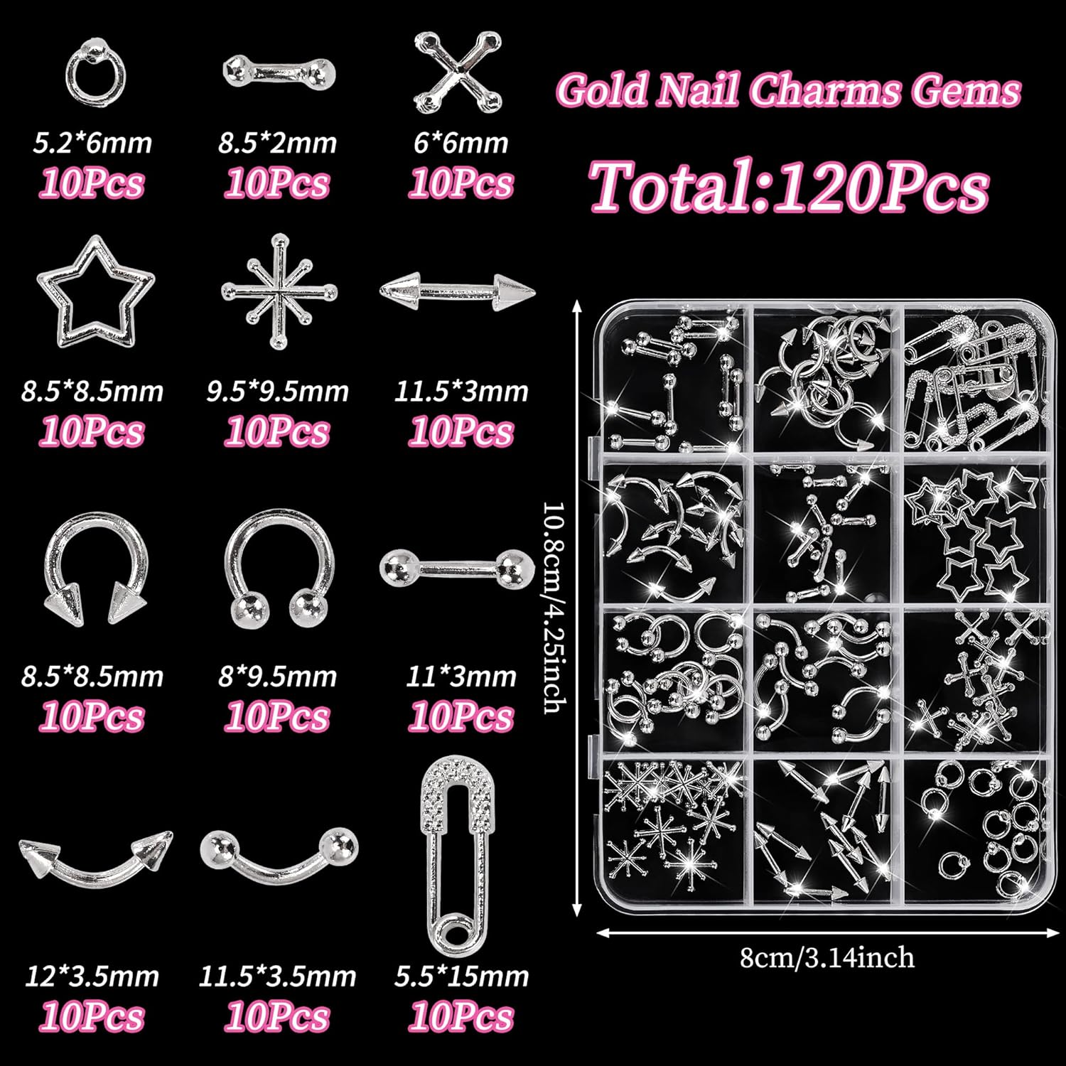 - Package of Nail Art Supplies Includes: 120 Pcs nail gems and charms in assorted styles, for nail decorations. The Y2K nail charms silver offer endless design possibilities to meet all your everyday needs