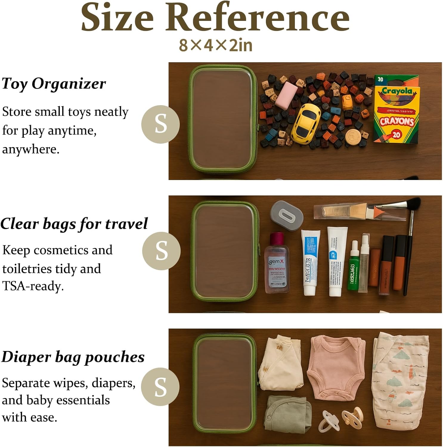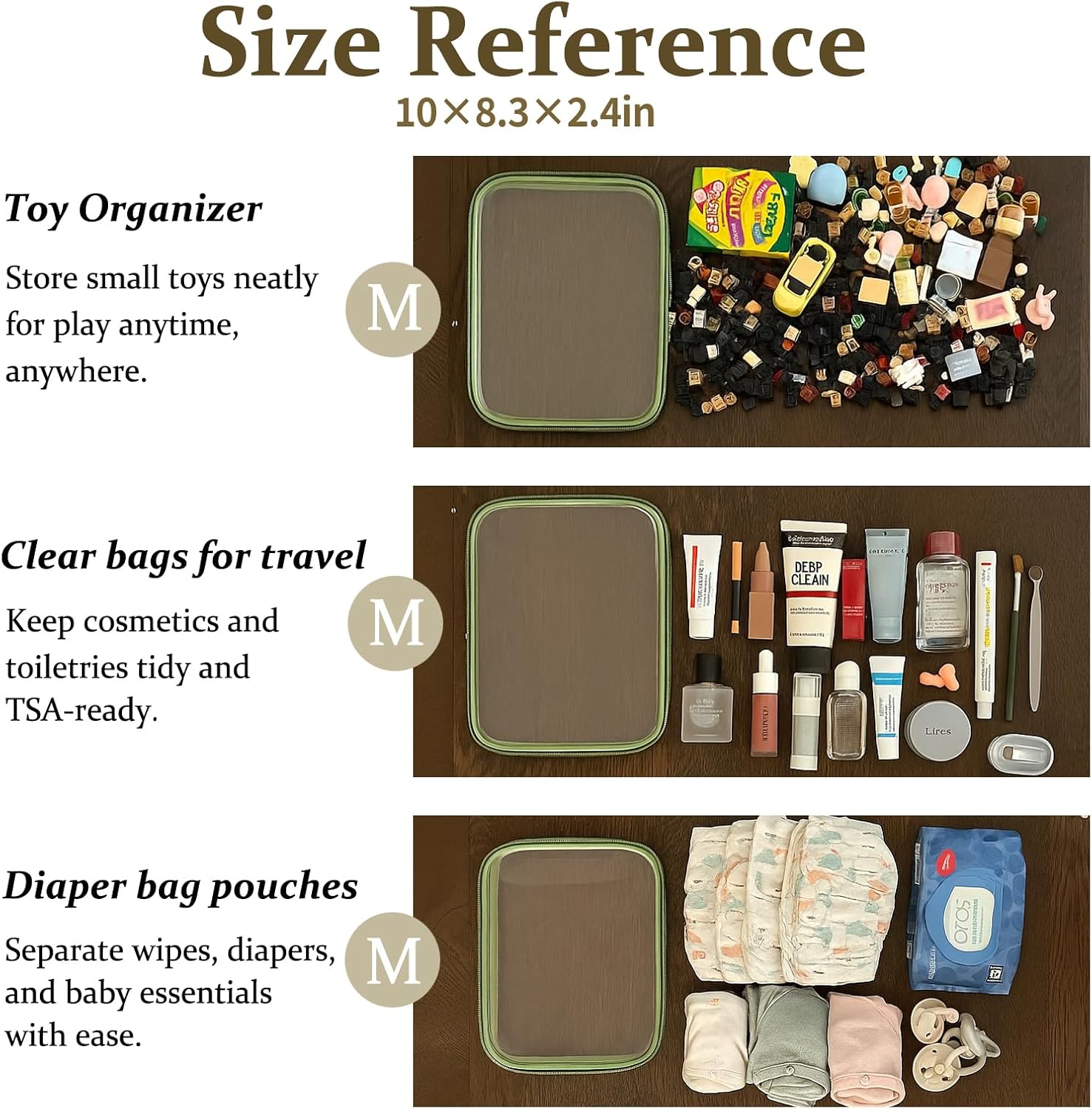 • Multi-Use Storage for Daily Essentials. Perfect as a bag organizer for makeup, toiletries, charging cables, pens, or travel-size items. Whether at home or packing a diaper bag, these clear zipper pouches help sort small items with ease.