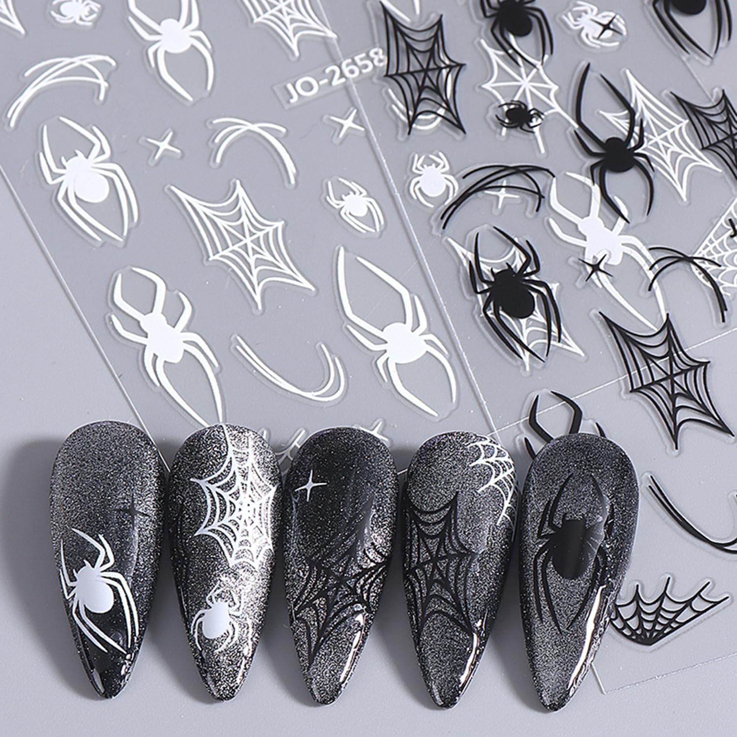 - Quantity: You will get 5 sheets of Halloween nail art stickers, including spider and spider web pattern designs, not easy to fall off or fade, can easily create a variety of themed nail art