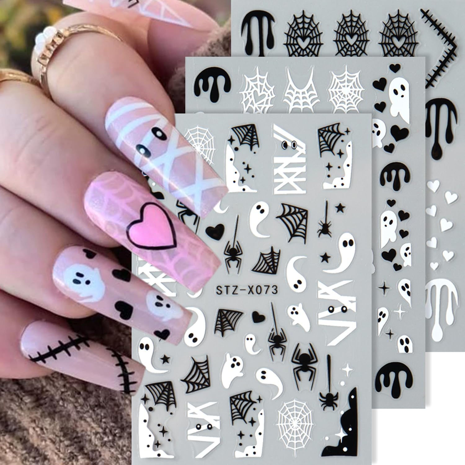 - Quantity: You will get 8 sheets of Halloween white ghost nail art stickers, including bat and spider web pattern designs, not easy to fall off or fade, can easily create a variety of themed nail art