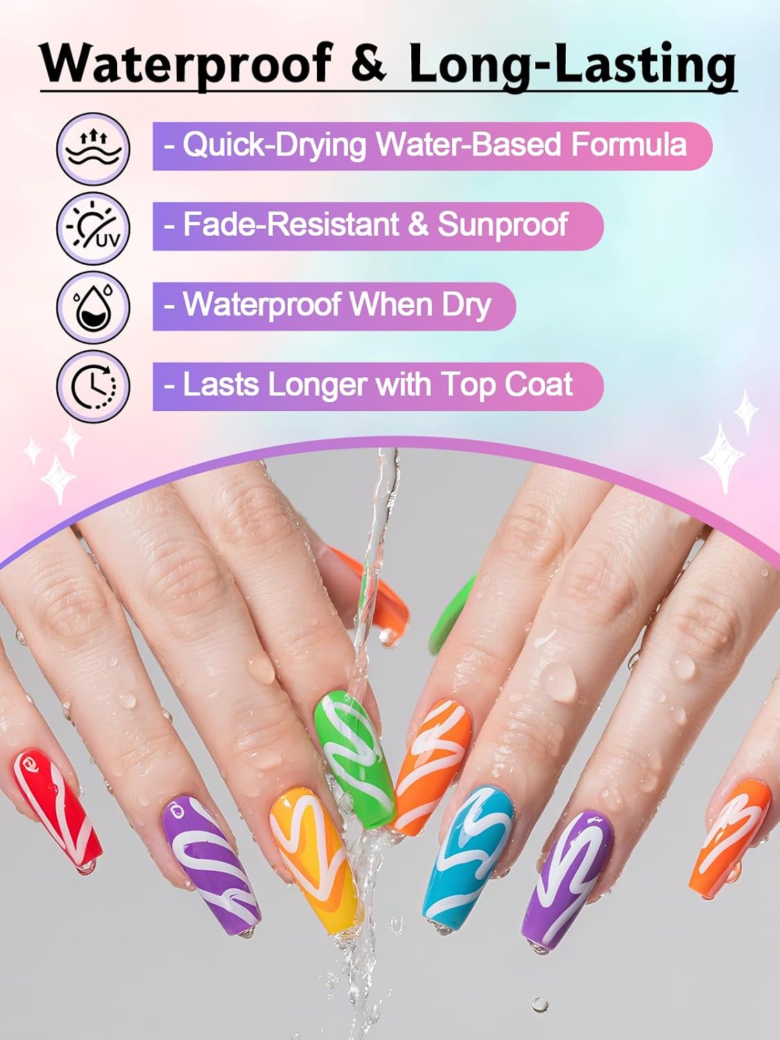- 【NOTE】 - The nail art pens to be used with nail polish top coat, even if the drawing is wrong, just wipe it with alcohol. Until the drawing is completed, the nail polish top coat can be applied to the picture after air-drying. Need to cover the cap after use to prevent the pen from drying out.